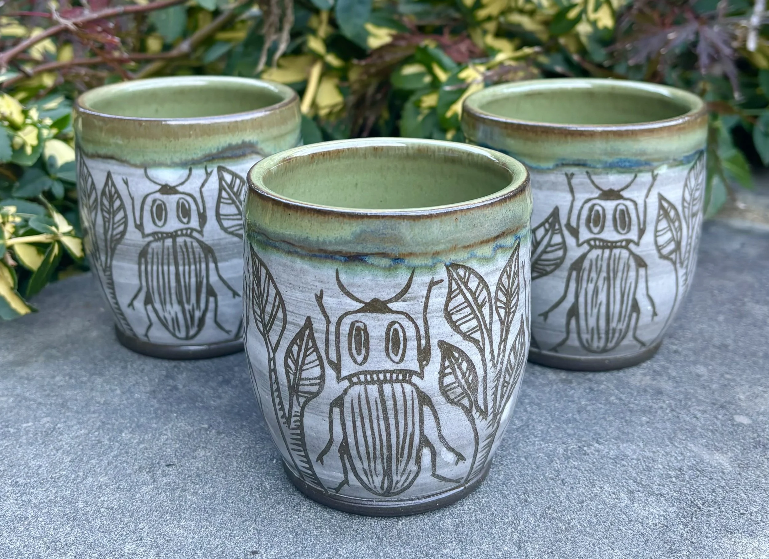 In her ceramic work she uses a pottery wheel to make functional ceramic wares. After the clay has been fired once, glaze is applied using a paint brush. The most exciting part of the process is opening the kiln after the second firing and getting to see how everything came together. No piece is ever the same.