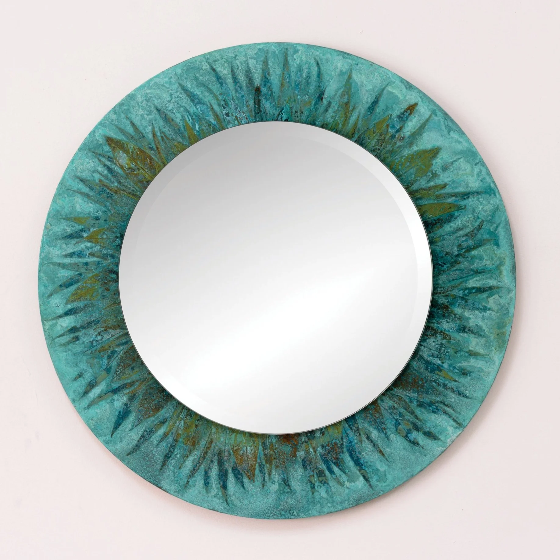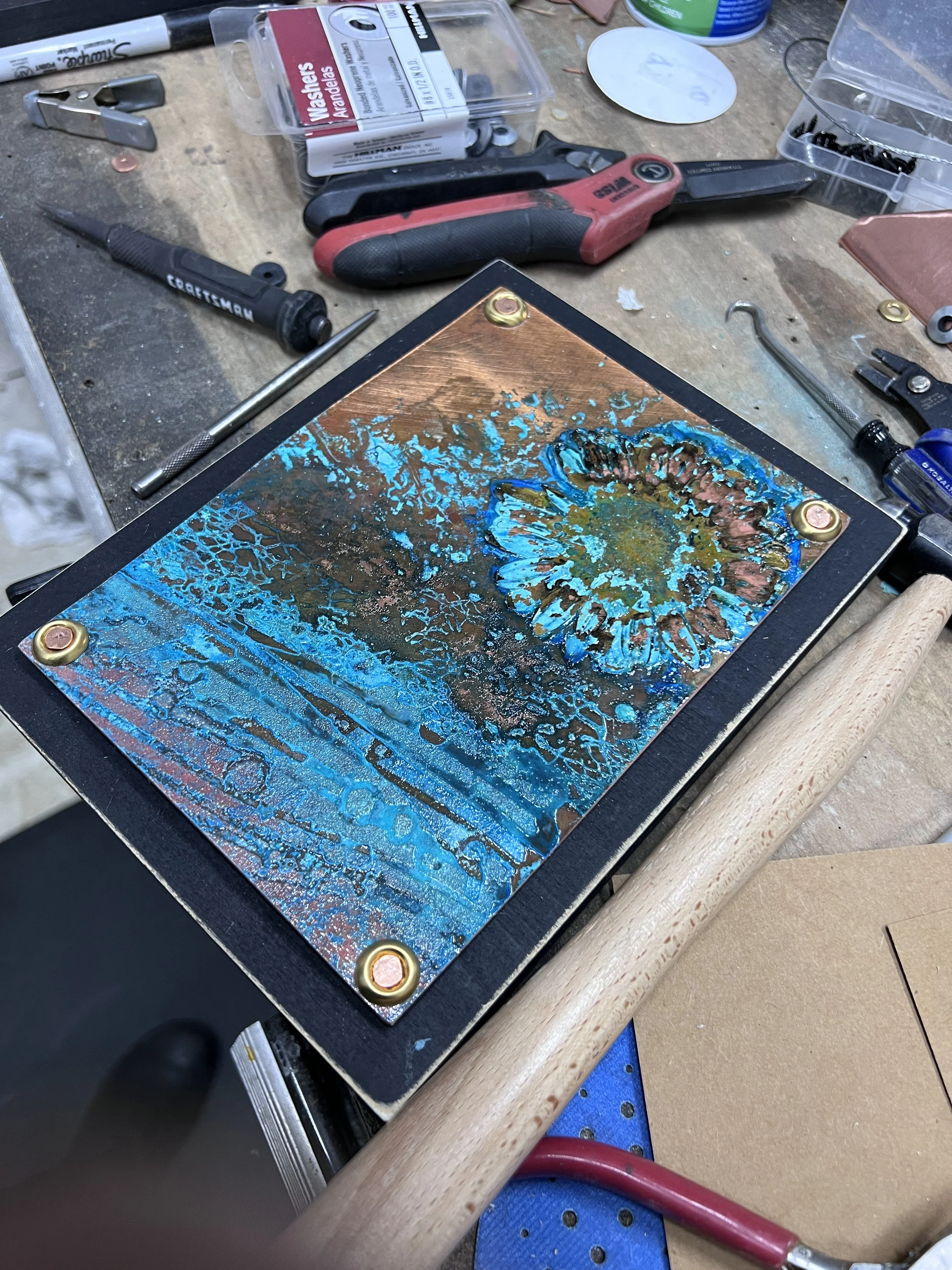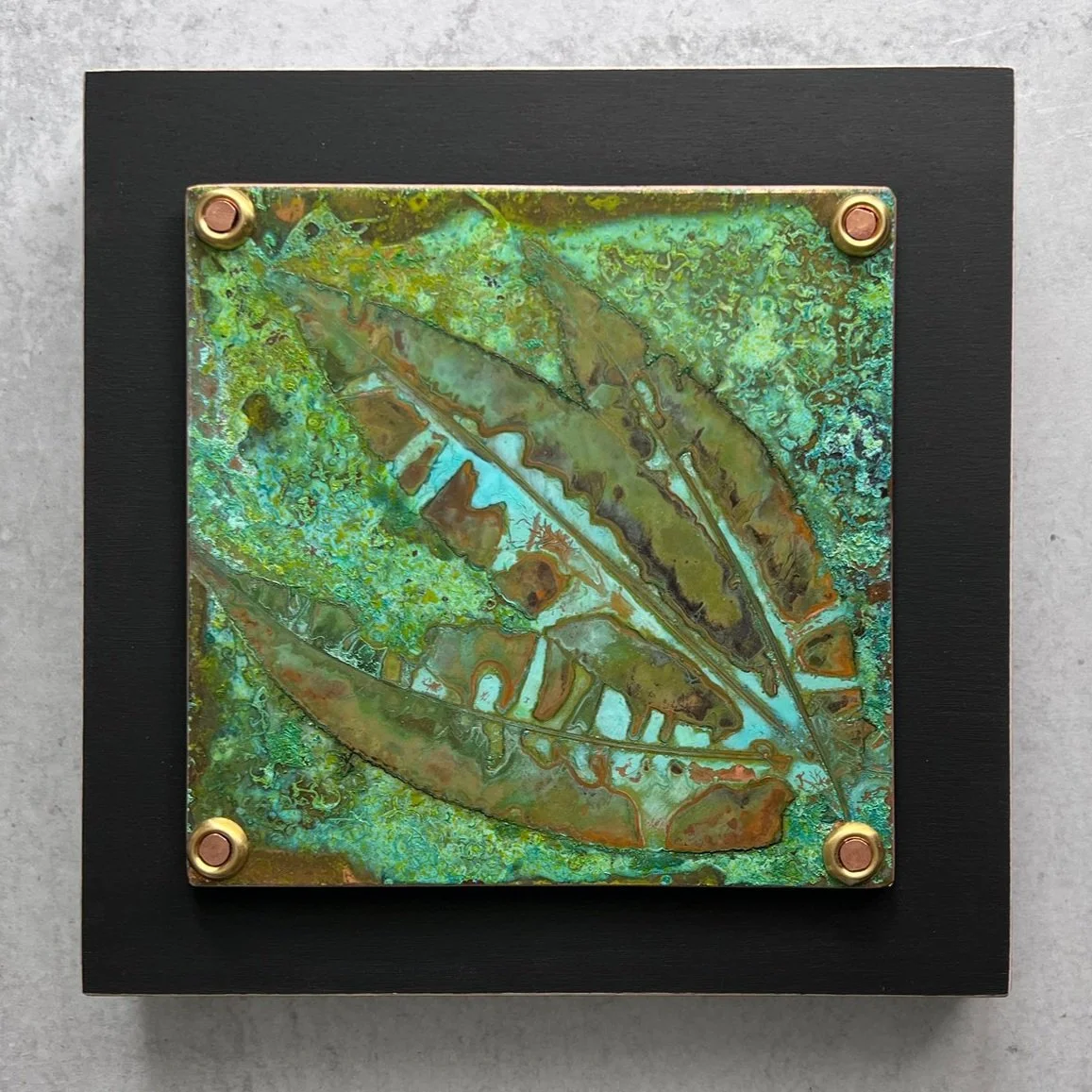 Coppersmith Cathy G. Vaughn, with a background in printmaking, graphic design, gardening, and tinkering, has developed unique chemical techniques to render images on copper. Drawing from her love of nature, experimentation, and a generations-long heritage of fine craftsmanship, she creates copper abstractions, collages, and dimensional installations using oxidation patterns created using leaves and found objects.
