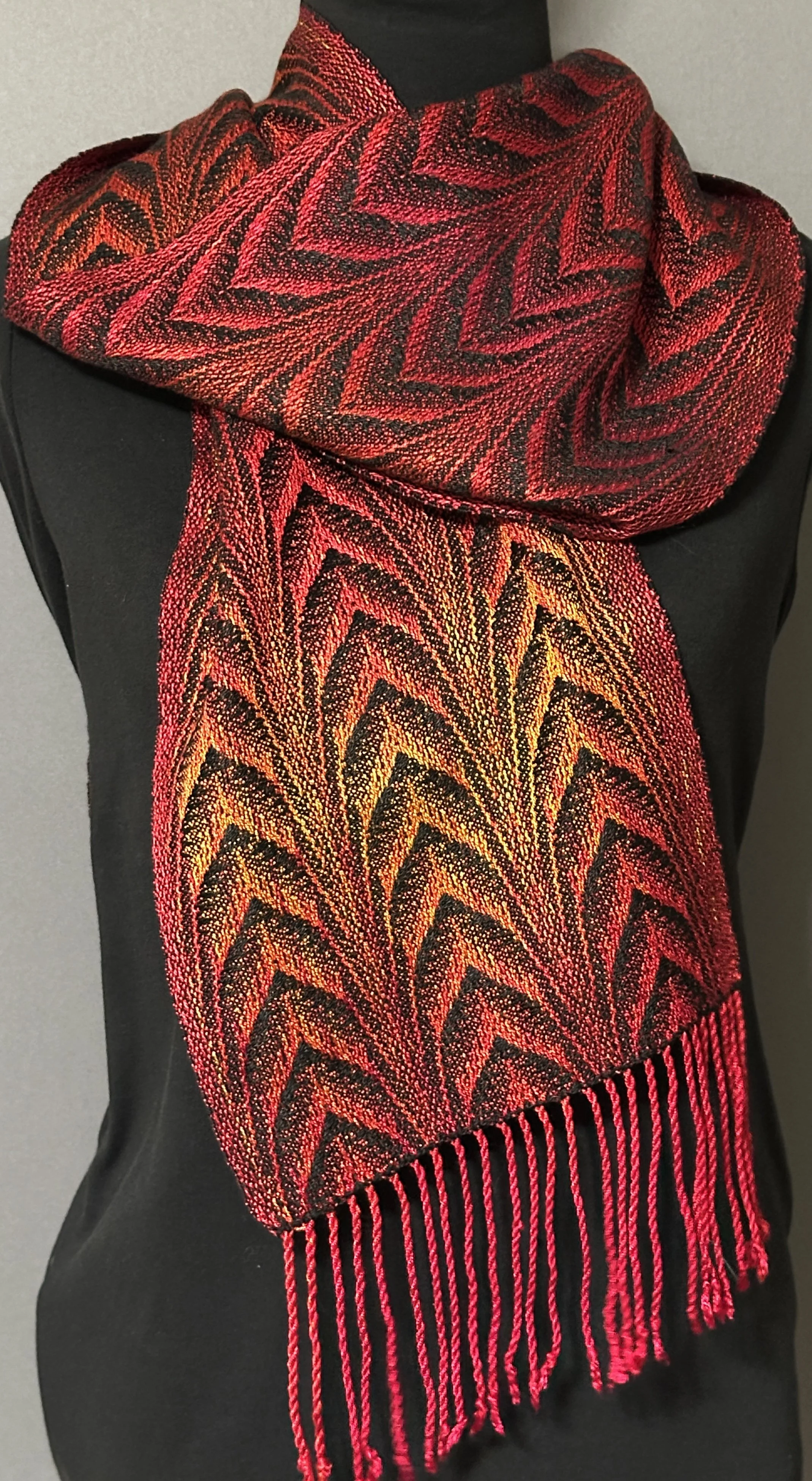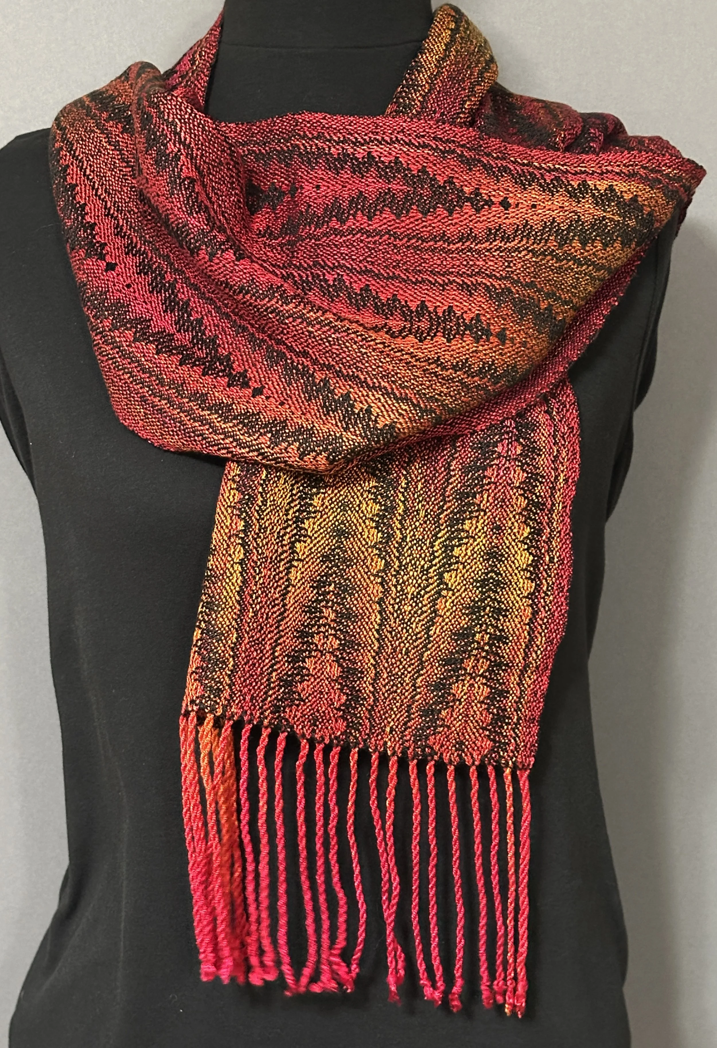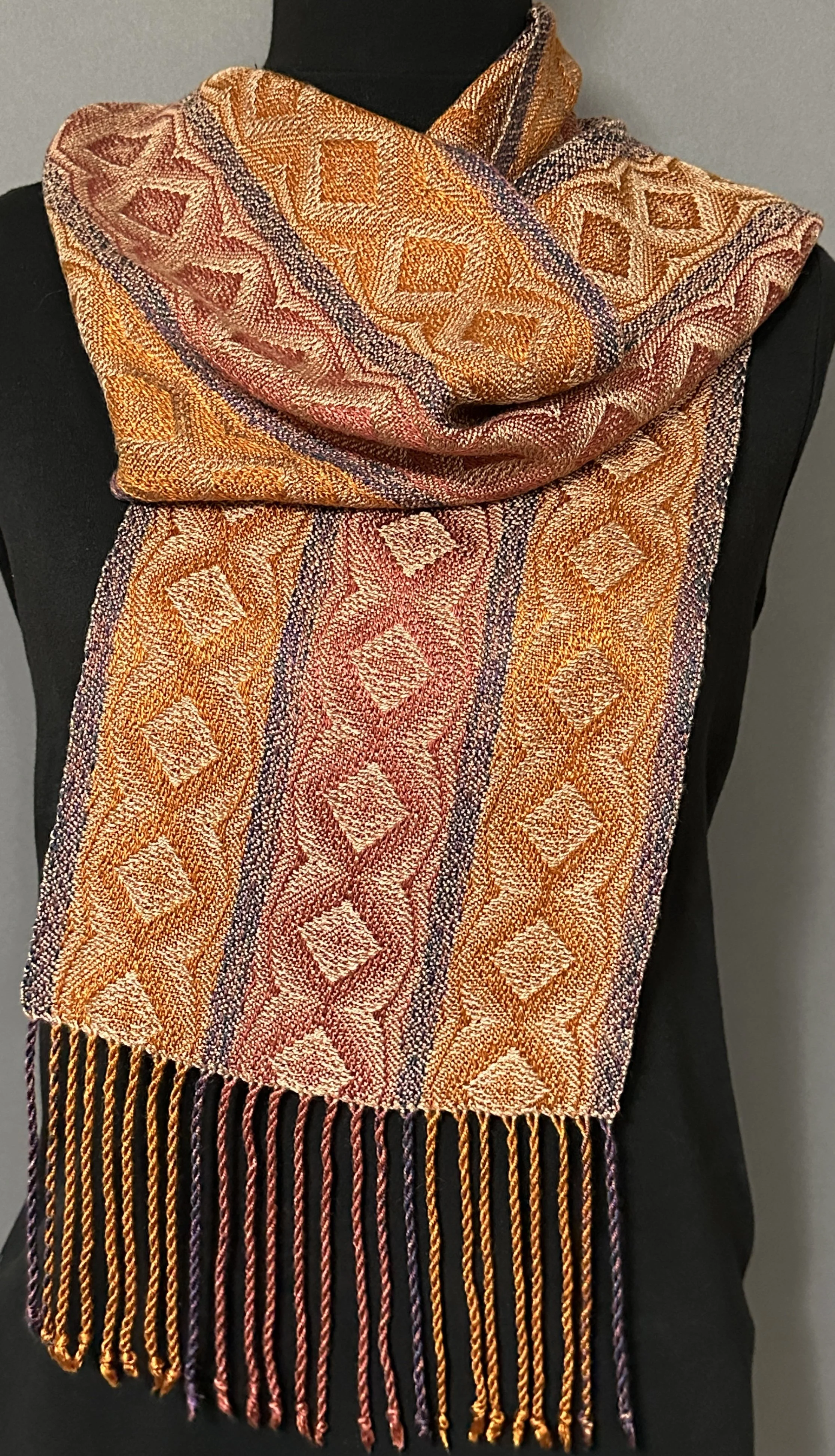 Colors speak to me, and I love playing with different hues as I weave. Despite our differing preferences, most of us agree on which color combinations are calming, which are cheerful, and which denote danger. We don’t even know why colors elicit responses. It isn’t a logical process but, like music, colors bypass the head and speak straight to the heart. My works explore how fabric woven with a variety of dyed threads elicits feelings. The repetition of cool tones can draw one into meditation. The contrast of sharp borders can pique interest. Waves of floral tones can create movement through a piece. Each work instills a mood through color.