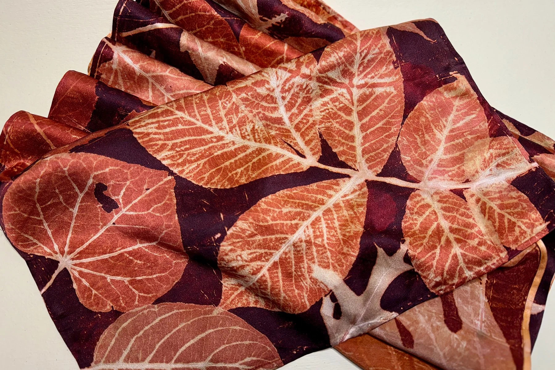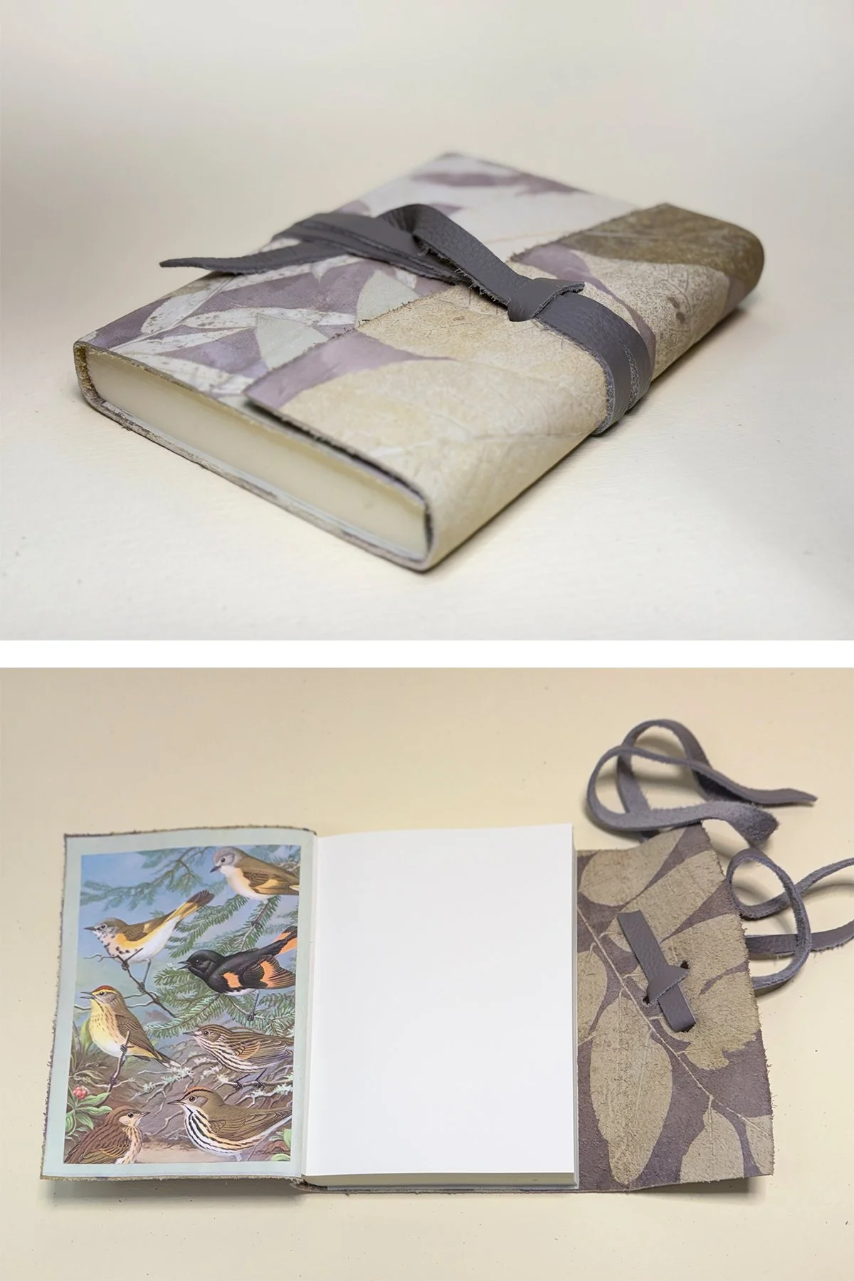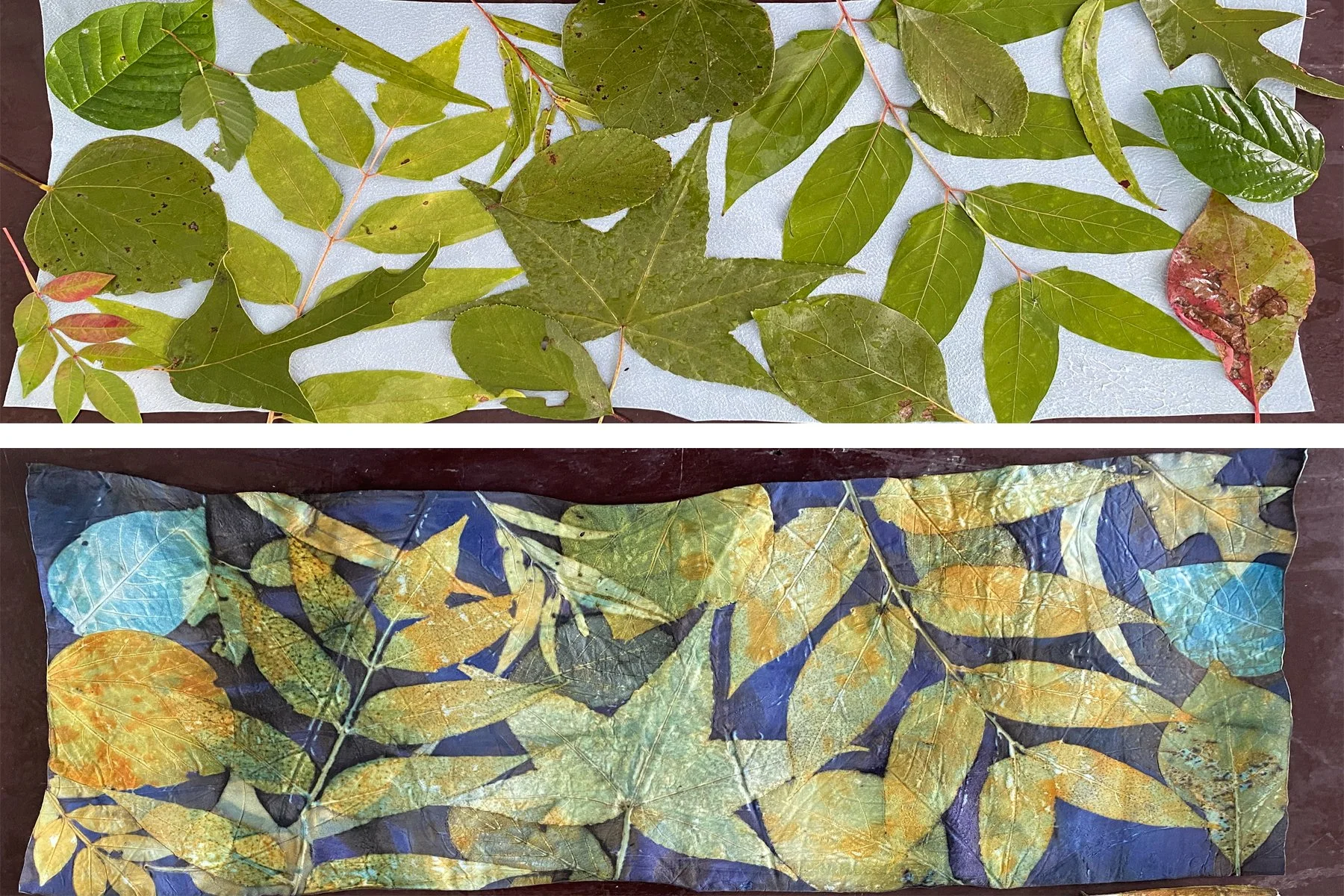 Liz Buckner-Yordy creates art in the shadow of the Blue Ridge Mountains, on a 30-acre property known as Petite Buzz Farm, home to a stunning variety of trees. Their leaves inspire and shape her botanical printing projects, bringing the beauty of the land into each piece. Liz specializes in hand-stitched leather journals and a range of small leather goods—earrings, wallets, bookmarks, and more—ensuring every scrap is put to creative use. She also prints on silk and wool, allowing this remarkable art form to shine across different mediums. For Liz, preserving a piece of nature through craft is both intentional and deeply meaningful.