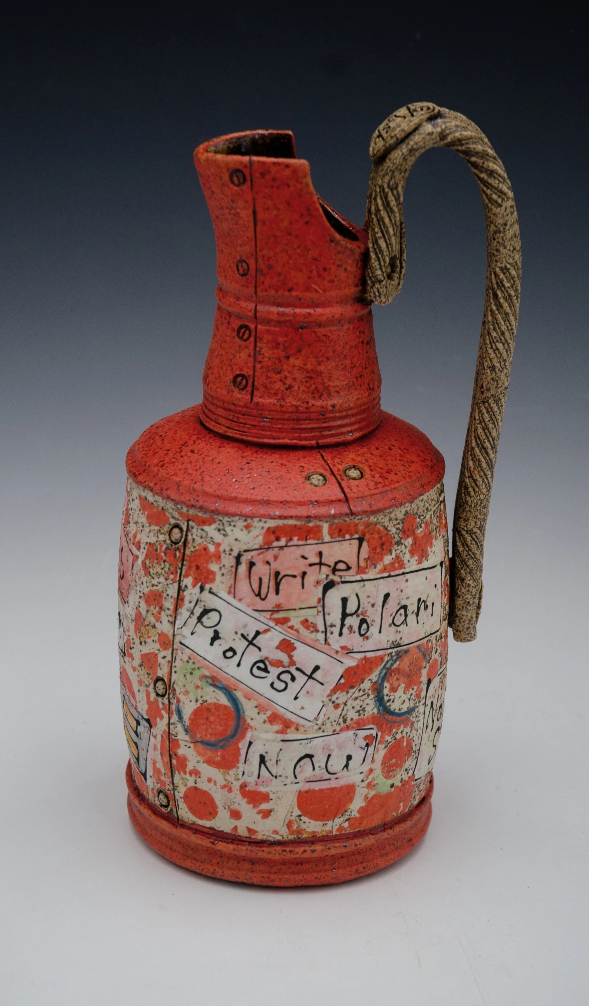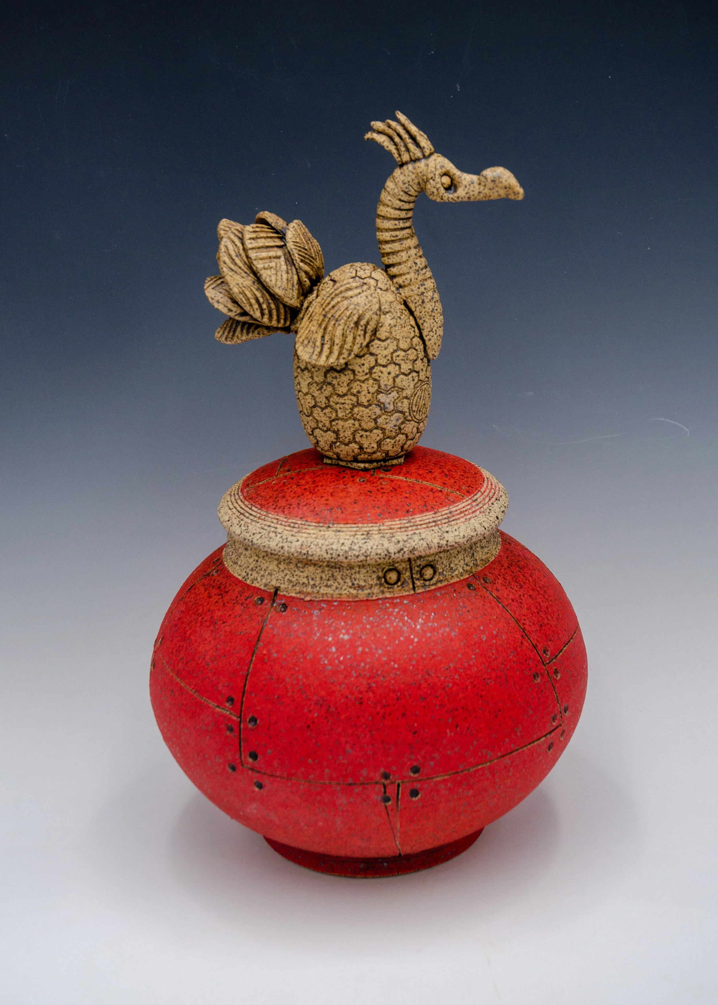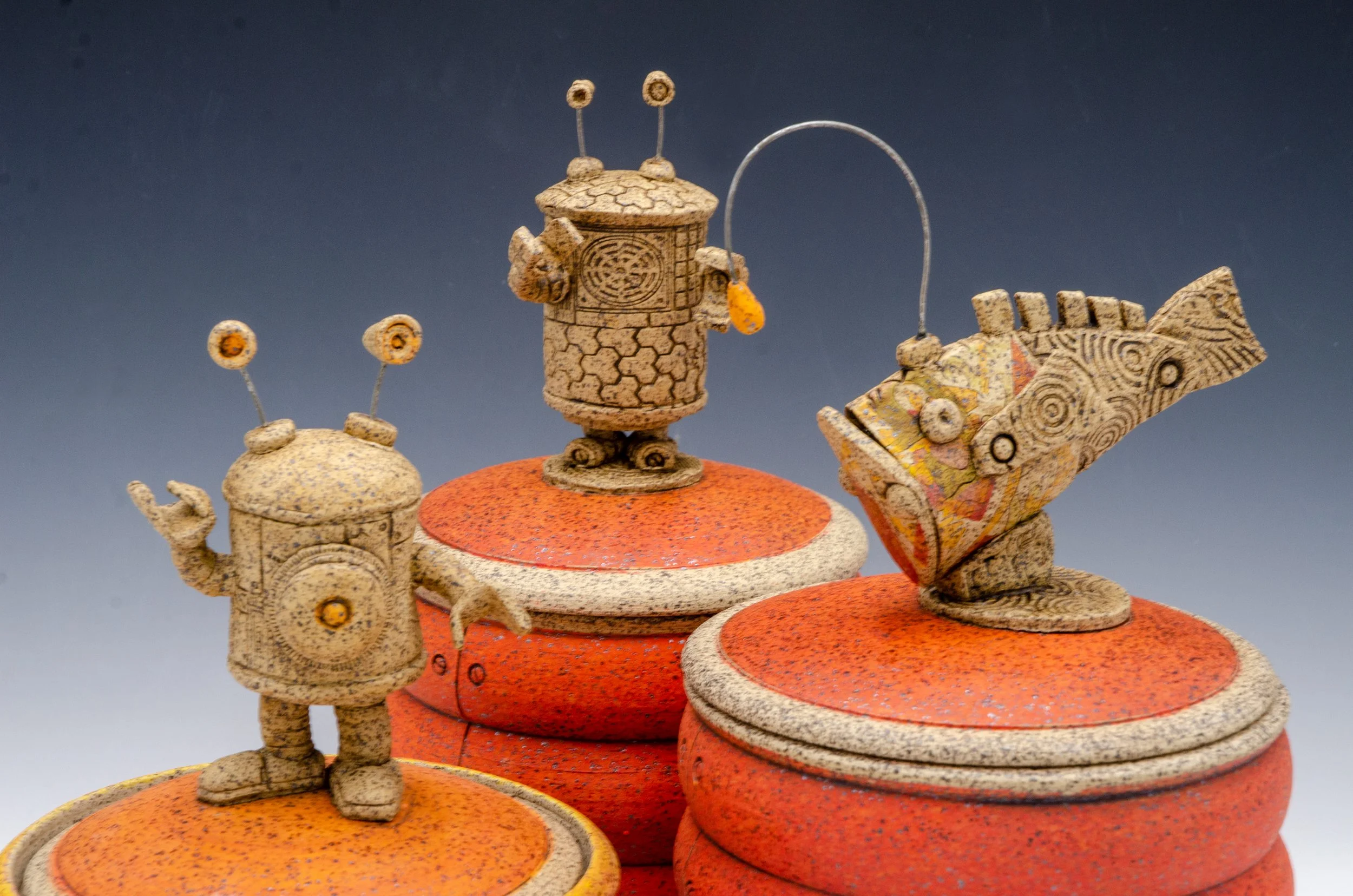 My pieces are influenced by the concept of retro-futurism, aka Jules Verne and his many fantastic adventures. The surface design stems from finding beauty in the aged machinery of the industrial era, metal with a patina of rust and oil. The images and drawings are inspired by my nephews, who are a constant source of inspiration. The sculptural elements are from the things of childhood—a toy rocket ship, a plastic dinosaur, and robots, lots of robots.